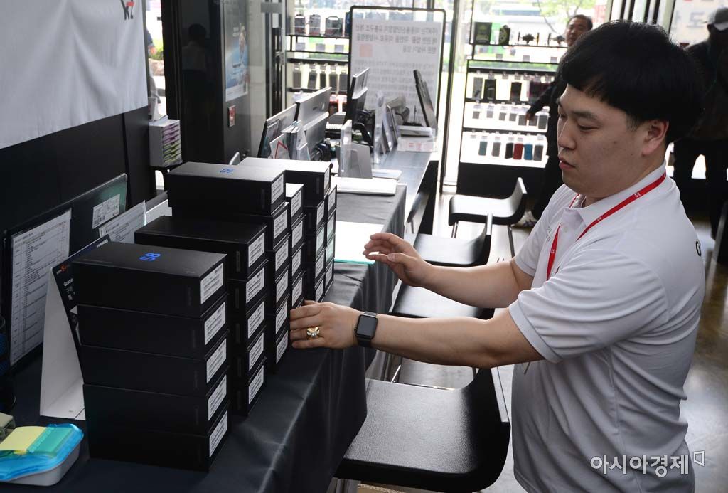 [아시아경제 백소아 기자] 갤럭시S8이 정식 출시된 21일 서울 종로구 광화문KT스퀘어에서 직원들이 판매 준비를 하고 있다.백소아 기자 sharp2046@asiae.co.kr<ⓒ세계를 보는 창 경제를 보는 눈, 아시아경제(www.asiae.co.kr) 무단전재 배포금지>