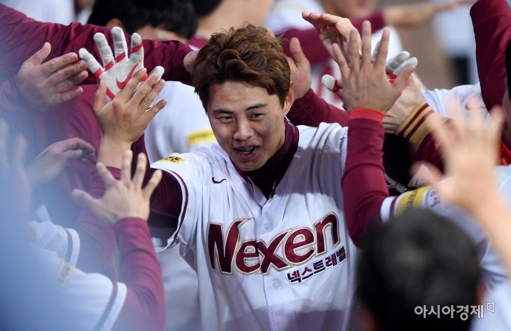 [아시아경제 김현민 기자]프로야구 롯데 자이언츠와 넥센 히어로즈의 2017 KBO리그 경기가 21일 서울 고척돔에서 열렸다. 8회말 2사에서 넥센 허정협이 롯데 배장호를 상대로 좌월 솔로 홈런을 치고 동료들과 기뻐하고 있다. 김현민 기자 kimhyun81@asiae.co.kr<ⓒ세계를 보는 창 경제를 보는 눈, 아시아경제(www.asiae.co.kr) 무단전재 배포금지>