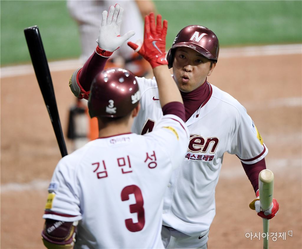 [아시아경제 김현민 기자]프로야구 롯데 자이언츠와 넥센 히어로즈의 2017 KBO리그 경기가 21일 서울 고척돔에서 열렸다. 8회말 2사에서 넥센 채태인이 롯데 배장호를 상대로 백투백 홈런을 치고 동료들과 기뻐하고 있다. 김현민 기자 kimhyun81@asiae.co.kr<ⓒ세계를 보는 창 경제를 보는 눈, 아시아경제(www.asiae.co.kr) 무단전재 배포금지>