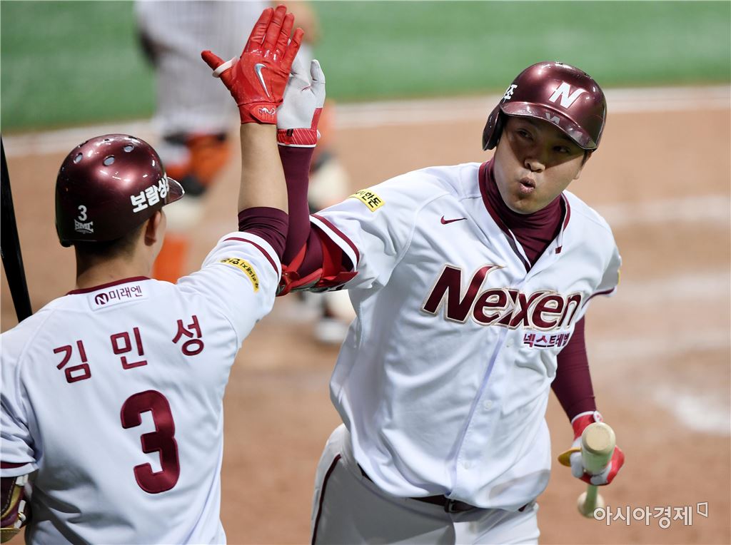 [아시아경제 김현민 기자]프로야구 롯데 자이언츠와 넥센 히어로즈의 2017 KBO리그 경기가 21일 서울 고척돔에서 열렸다. 8회말 2사에서 넥센 채태인이 롯데 배장호를 상대로 백투백 홈런을 치고 동료들과 기뻐하고 있다. 김현민 기자 kimhyun81@asiae.co.kr<ⓒ세계를 보는 창 경제를 보는 눈, 아시아경제(www.asiae.co.kr) 무단전재 배포금지>