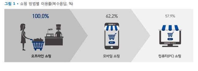 [아시아경제 안하늘 기자]귀찮은 공인인증서 대신 편리한 모바일 간편결제 서비스가 대세임을 입증했다. 모바일 쇼핑 이용률이 PC 쇼핑 이용률보다 높은 것으로 조사됐다.24일 미래창조과학부와 한국인터넷진흥원이 최근 발표한 '2016 디지털경제생활조사'에 따르면 인터넷이용자 중 모바일 쇼핑을 이용한다는 응답은 62.2%를 차지한 반면 PC 쇼핑을 이용한다는 응답은 57.9%로 나타났다.PC 쇼핑의 경우 남성(57.0%)과 여성(58.9%)의 이용률이 비슷한 수준으로 나타났으나, 모바일쇼핑은 여성(67.3%) 이용률이 남성(57.2%)에 비해 10%포인트(p) 이상 높았다. 주요 결제 채널을 보면 오프라인(83.8%)의 비중이 가장 높았으며, 모바일(9.6%), PC(6.6%) 순으로 나타났다.20대의 경우 모바일 쇼핑 이용률이 85.8%, 30대는 79.4%를 나타낸 반면 40대는 60.4%, 50대는 32.5%를 기록했다. PC 쇼핑도 마찬가지로 20대가 76.8%, 30대가 73.6%, 40대가 60%, 50대는 32.7%로 연령이 올라갈수록 이용률이 낮아졌다.PC 쇼핑은 결제시 '엑티브X', '공인인증서' 등 각종 절차를 밟아야 하나 모바일 쇼핑의 경우 각종 간편결제 서비스 덕분에 쇼핑이 간편하다. PC, 모바일 쇼핑을 이용하는 이유로 '시간/공간 제약 없이 쇼핑할 수 있어서', '다양한 상품에 대한 정보(가격비교 등)가 풍부해서', '오프라인 쇼핑보다 저렴하게 구입할 수 있어서' 등의 응답이 나온 가운데 모바일 쇼핑 이용자 중 35%는 'PC를 이용한 쇼핑보다 간편해서'라고 답했다.사진=미래창조과학부, 인터넷진흥원