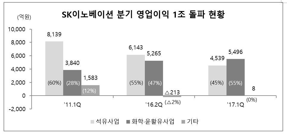 -1분기 매출 11조3871억, 영업이익 1조43억-지난해 최대 영업이익 이어 올해도 호실적-에너지·화학 성장기반 구축 평가 [아시아경제 노태영 기자]SK이노베이션이 비(非)석유부문의 영업이익이 절반을 넘긴 가운데 분기 첫 1조원을 돌파했다.SK이노베이션은 25일 2017년 1분기 실적발표를 통해 연결기준 매출액 11조3871억원, 영업이익 1조43억원을 기록했다고 밝혔다. 전년 동기 대비 각각 20%, 19% 증가한 수치로 화학·윤활유 등 비석유부문의 영업이익이 50%를 넘겨 나온 첫 실적이다. 분기 영업이익 1조원을 돌파한 것은 지난해 2분기 이후 3분기만으로 이번이 역대 세번째다. SK이노베이션 측은 비석유부문 신장에 따라 영업이익이 크게 개선되었다면서 최근 강력하게 추진해 온 ‘펀더멘털 딥 체인지(Fundamental Deep Change)에 따른 것이라고 밝혔다. 이는 석유사업 중심에서 에너지·화학으로 포트폴리오가 진화해 회사의 수익창출 방식이 달라졌다는 얘기라고 덧붙였다. 1분기 석유사업은 매출 8조636억원, 영업이익 4539억원을 기록했다. 유가 상승 효과가 소멸하면서 직전분기 대비 영업이익이 줄긴 했으나, 전년 동기에 비해서는 16% 늘었다. 이는 국제유가가 1분기 내내 50달러대 초반에 머무는 저유가 기조 속에서도 이익을 극대화한 것으로 풀이된다.특히 화학사업은 분기 사상 최대 실적을 갱신함과 동시에 석유사업의 영업이익을 앞서게 됐다. 화학사업은 주요 공정이 직전분기에 정기보수를 마치고 본격 재가동에 들어간 가운데 에틸렌, 파라자일렌 등 주요 제품의 스프레드가 강세를 보여 4547억원의 영업이익을 기록했다. 화학사업은 1분기에 지난해 연간 영업이익의 40%에 육박하는 실적을 기록하는 등 향후 회사 전체의 성장을 주도하는 성장사업으로 확실하게 자리매김할 것으로 보인다. SK이노베이션 관계자는 “지난 수년간의 투자를 통해 규모를 확대하고 파라자일렌 등 고마진 제품의 생산설비를 확충한 결과, 화학사업의 이익 규모가 업그레이드 됐다”면서 “2분기로 예정된 역내 에틸렌, 파라자일렌 설비의 정기보수 등을 감안할 때 호실적이 이어질 것”으로 전망했다.이밖에 윤활유사업은 공급 부족으로 인한 윤활기유 스프레드 강세 등으로 직전분기 대비 10% 증가한 949억원의 영업이익을 기록했다. 2분기에는 성수기 도래에 따른 판매량 증대로 수익성이 개선될 것으로 전망된다. 또 석유개발사업은 유가 상승 효과로 직전분기 대비 285억원 증가한 573억원의 영업이익을 기록했다. 1분기 일 평균 생산량은 5만4000배럴로 직전분기 대비 약 8000배럴 감소했다.노태영 기자 factpoet@asiae.co.kr<ⓒ세계를 보는 창 경제를 보는 눈, 아시아경제(www.asiae.co.kr) 무단전재 배포금지>