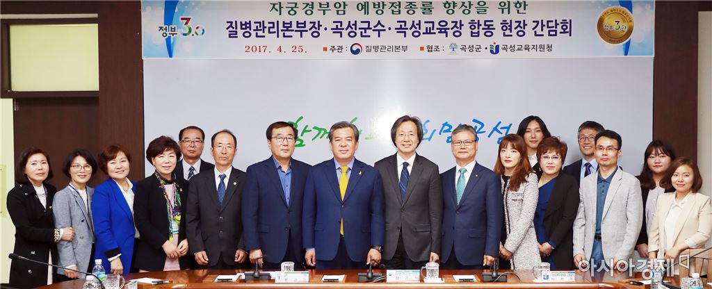 "자궁경부암 예방접종률 1위 곡성" [아시아경제 노해섭 기자]곡성군(군수 유근기)에서 25일 질병관리본부 주관으로 보건교육당국 합동 현장 간담회를 개최했다. 이번 간담회는 만 12세 여성청소년의 자궁경부암 예방접종률 전국 1위 지자체인 곡성에서 개최되어 의미가 크다 .간담회에는 정기석 질병관리본부장, 유근기 곡성군수, 박찬주 곡성교육장 등 업무 관계자 17여명이 참석했으며, 질병관리본부장은 간담회를 통해 보건의료원 및 학교 현장 의견을 청취하고, 자궁경부암 예방접종사업에 힘써 준 보건당국과 적극 협력해 준 교육당국에 격려와 감사를 전했다.질병관리본부와 곡성군은 16년 6월 20일부터 여성 청소년의 건강한 성장 지원과 자궁경부암 예방을 위해 의료인과의 건강 상담과 자궁경부암 예방접종을 제공(6개월 간격, 2회)하는 ‘건강여성 첫걸음 클리닉’사업을 시행하고 있다.곡성군은 04년생의 자궁경부암 예방접종률이 86.3%로, 전국 255개 보건소(전국 평균 46.6%) 중 가장 높은 지역이다. 곡성군 김영락 보건의료원장은“보건교육당국이 접종 대상자 현황을 공유하여 대상자의 재학 상황을 파악하고, 교육청이 학교별로 접종대상자 명단을 통보하면 학교에서 가정통신문 등으로 접종을 안내하고 있다”고 설명했다.또한 “예방접종 담당자들이 사업 시행 초기부터 각종 홍보수단을 이용해 주민들게 홍보한 결과라며, 아직까지 미접종 학생을 위해 개별 전화로 적기 예방접종할 수 있도록 접종을 독려하겠다”고 말했다. 간담회에 참석한 유근기 곡성군수는 "2017년에도 보건·교육당국과 중앙·지자체 공동 협력으로 여성청소년의 건강 보호를 위해 최선을 다하겠다”고 밝혔다.노해섭 기자 nogary@<ⓒ세계를 보는 창 경제를 보는 눈, 아시아경제(www.asiae.co.kr) 무단전재 배포금지>