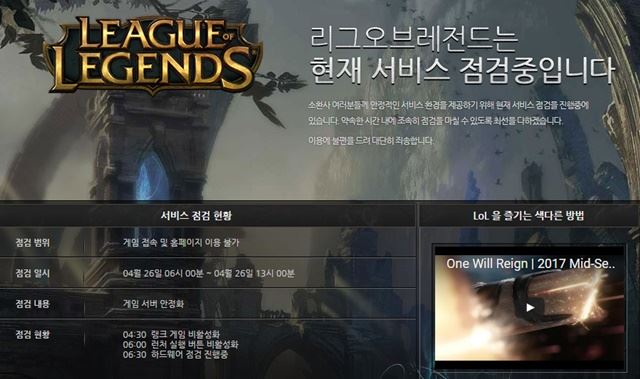 라이엇게임즈는 오늘(26일) 오전 6시부터 오후 1시까지 서비스 점검을 진행 중이다./사진=리그오브레전드 홈페이지 캡처