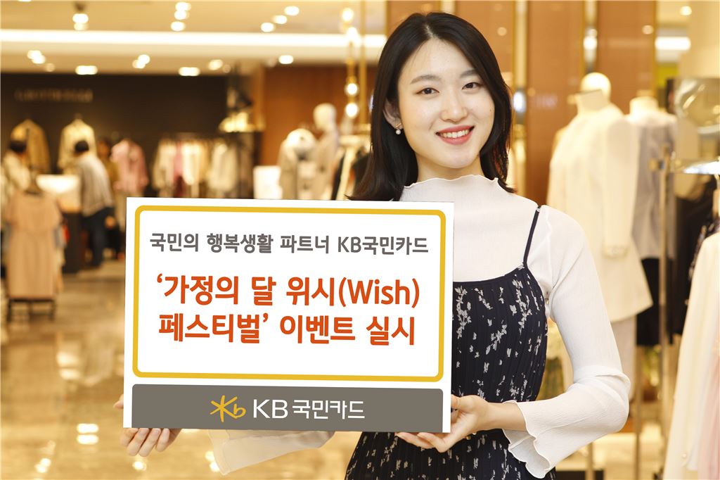 [아시아경제 정현진 기자] KB국민카드가 5월 가정의 달을 맞아 '가정의 달 위시(Wish) 페스티벌' 이벤트를 진행한다고 26일 밝혔다.다음달 31일까지 KB국민카드(KB국민 기업카드, KB국민 비씨카드, KB국민 선불카드 제외)로 건당 3만원 이상 사용하고 다음달 2일부터 31일까지 가위바위보 게임에 참여하면 △100만원 캐시백(1명) △10만원 캐시백(10명) △5만원 캐시백(100명) △3000원 캐시백(2만7666명) △비타민 음료 모바일 쿠폰(5만명) 등 총 7만7777명에게 경품을 제공한다.행사기간 중 10회 이상 게임에 참여한 고객을 대상으로 추첨해 1명에게 'G4렉스턴' 자동차를 증정한다.또 다음달 14일까지 행사 응모 후 5월 1일부터 5월 14일까지 KB국민카드(KB국민 기업카드, KB국민 선불카드 제외)로 50만원 이상 사용하면 추첨을 통해 △가족 여행지원비 50만원(50명) △가족 외식지원비 10만원(100명) △GS칼텍스/홈플러스 모바일 상품권 2만원(300명) △GS25 상품권 5000원(5105명) 등 총 5555명에게 경품을 제공한다.같은 기간 백화점 업종에서는 KB국민카드(KB국민 체크카드, KB국민 기업카드, KB국민 비씨카드, KB국민 선불카드 제외)로 △20만원 이상 이용 시 1만원 △40만원 이상 이용 시 2만원이 캐시백 되고, 롯데백화점 등 주요 백화점 이용 시 결제금액에 따라 최대 25만원까지 상품권도 증정한다.롯데백화점에서 이달 28~30일 또는 다음달 5~7일에 △30만원 이상 사용 시 2만원 상품권 △60만원 이상 사용 시 4만원 상품권 △100만원 이상 사용 시 7만원 상품권을 증정한다. 현대백화점에서는 다음달 7일까지 △20만원 이상 사용 시 1만원 상품권 △40만원 이상 사용 시 2만원 상품권을 증정한다.AK플라자에서 다음달 9일까지 △30만원 이상 사용 시 1만 5000원 상품권 △60만원 이상 사용 시 3만원 상품권 △100만원 이상 사용 시 5만원 상품권 △200만원 이상 사용 시 10만원 상품권을 증정한다.갤러리아에서는 다음달 7일까지 단일 브랜드에서 △30만원 이상 사용 시 1만 5000원 상품권 △60만원 이상 사용 시 3만원 상품권 △100만원 이상 사용 시 5만원 상품권을 증정한다.명품관의 경우 단일 브랜드에서 △60만원 이상 사용 시 3만원 상품권 △100만원 이상 사용 시 5만원 상품권 △300만원 이상 사용 시 15만원 상품권 △500만원 이상 사용 시 25만원 상품권을 증정한다.주요 생활 편의 업종에서는 무이자 할부 혜택이 있다. 6월 말까지 KB국민카드(KB국민 체크카드, KB국민 기업카드, KB국민 비씨카드, KB국민 선불카드 제외)로 △백화점, 대형의류쇼핑센터, 전자상거래, 면세점 등 6개 업종 이용 시 2~6개월 △항공사, 호텔, 병원, 학원, 화장품 등 36개 업종 이용 시 2~5개월 △슈퍼마켓, 대형할인점, 오픈마켓, 미용원 등 14개 업종 이용 시 2~3개월 무이자 할부 혜택을 누릴 수 있다.또 다음달 31일까지 행사 응모 후 KB국민 체크카드(KB국민 비씨플러스카드, KB국민 프리패스카드, KB국민 기업체크카드 제외)로 행사 기간 중 △백화점 △대형할인점 △대형의류쇼핑센터 △패밀리레스토랑 △놀이공원 등 5개 업종에서 합산금액 기준 20만원 이상 사용하면 7000원이 캐시백 된다.행사 응모는 KB국민카드 홈페이지 또는 모바일 애플리케이션에서 가능하며, 기타 자세한 사항은 KB국민카드 홈페이지 또는 고객센터(1588-1688)를 통해 확인 가능하다.정현진 기자 jhj48@asiae.co.kr<ⓒ세계를 보는 창 경제를 보는 눈, 아시아경제(www.asiae.co.kr) 무단전재 배포금지>정현진 기자 jhj48@asiae.co.kr<ⓒ아시아 대표 석간 '아시아경제' (www.newsva.co.kr) 무단전재 배포금지>