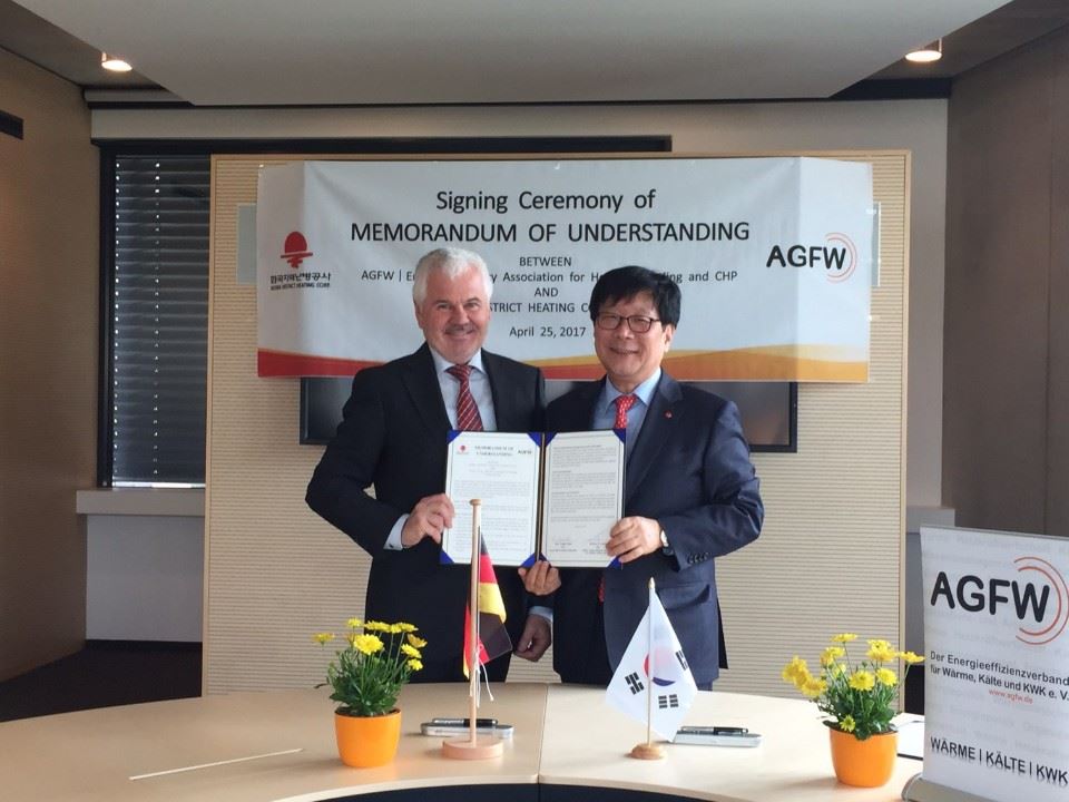 김경원 한국지역난방공사 사장(오른쪽 네번째)과 베르너 루치 독일 지역난방협회장(오른쪽 다섯번째)이 양해각서 체결후 기념사진을 찍고 있다.
