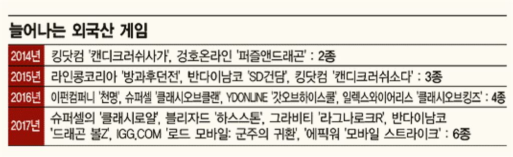 [아시아경제 임온유 기자] 5월12일 상장되면 시가총액 13조원을 훌쩍 넘어서는 넷마블. 9400억원을 들여 소셜 카지노업체 더블다운인터렉티브 인수를 추진하는 더블유게임즈. 7개월간 휴일 반납하도록 강요했다가 자율 근무로 방침을 바꾼 위메이드아이오. 이 세가지는 게임산업의 단면을 보여주는 대표적 사례다. 게임산업이 급성장하며 경제에서 차지하는 비중이 커졌다는 점과 함께 열악한 근로시간과 하도급 문제 등으로 논란을 불러일으키고 있다는 점이다. 사회적으로는 게임의 건전성에 대한 논란이 여전하다. 이런 가운데 정부는 산업 육성과 견제 사이를 오가고 있다. 규제는 게임을 소비하는 소비자들의 연령과 시간대, 비용 등에 폭넓게 걸쳐 있다. 게임산업의 현주소와 함께 숙제는 무엇인지 살펴본다.국내 모바일 게임 시장이 외산 게임에 서서히 잠식당하고 있다. 중국 등 글로벌 게임사들의 적극적 공세와 함께 이를 부추기는 것은 다양성이 결여된 국내 모바일 게임 생태계다. 그리고 그 중심에는 흥행 게임 베끼기에 몰두하는 국내 업계 관행이 자리잡고 있다.24일 구글 플레이 스토어의 매출 순위를 살펴보면 20위권에 이름을 올린 외산 게임은 슈퍼셀의 '클래시 로얄', 블리자드의 '하스스톤', 그라비티의 '라그나로크R' 등 모두 6종이다. 3년 전인 2014년만 해도 같은 시기 외산게임은 킹닷컴의 '캔디크러쉬사가' 등 2종에 불과했다.현재 넷마블의 '리니지2 레볼루션', '모두의 마블' 등과 게임빌의 '별이되어라' 등이 건재하지만 외산 게임의 점유율은 빠른 속도로 높아지고 있다. 20~30위권으로 시야를 넓히면 이러한 현상은 더욱 뚜렷해진다. 지난해 AR 게임 열풍을 불러온 나이언틱의 '포켓몬고', 슈퍼셀의 '클래시 오브 클랜' 등이 대표적이다.모바일 게임 시장의 글로벌화는 자연스러운 흐름이다. 다만 흥행 신작이 나오면 비슷한 류의 게임을 우후죽순 베끼는 등 혁신보다는 모방에 힘쓰는 업계 행태가 외산 게임의 잠식을 더욱 앞당기고 있다. 게임업계 한 관계자는 "흥행작과 유사한 게임을 내놓으면 인기에 편승할 수 있을 뿐만 아니라 게임 개발 기간을 단축할 수 있는 장점이 있다"며 "완전히 베끼지 않는 이상 법적 제재를 받지 않는 것도 모방 관행을 부추기는 이유"라고 설명했다. 게임업계가 '베끼기 논쟁'으로 오랫동안 몸살을 앓는 것도 바로 여기에서 비롯된다. 지난 1월 서울고등법원은 킹닷컴이 아보카도엔터테인먼트를 상대로 제기한 저작권 침해 및 부정경쟁행위 금지 소송에 대해 원고 패소 판결을 내렸다. 킹은 아보카도의 모바일 게임 '포레스트매니아'가 자사의 '팜히어로사가'의 저작권을 침해했다고 주장하며 소송을 제기했다. 킹은 ▲캐릭터 공격ㆍ수비 능력 등 사용자 경험의 유사성 ▲시각적 디자인 유사성 ▲게임보드 구성과 배치 등을 저작권 침해의 근거로 제시했다. 법원은 2015년 10월 1심에서 킹의 손을 들어줬지만 2심에서는 판결을 뒤집었다. 지난해 12월 NHN엔터테인먼트의 '프렌즈팝'과 카카오 게임즈의 '프렌즈팝콘' 사이에도 표절 논란이 있었다. 두 게임은 모두 카카오 프렌즈를 활용한 퍼즐 게임이다. 게임 커뮤니티에서 두 게임의 이름과 방식, 디자인 유사성에 대한 논쟁이 확산되며 촉발된 논란은 소송으로 이어지진 않았으나 이와 관련한 많은 논쟁을 양산했다. 이외에도 '부루마블' 개발사 아이피플스가 '모두의 마블'을 만든 넷마블게임즈가, '리니지'를 만든 엔씨소프트는 이츠게임즈의 '아덴'이 자사의 저작권을 침해했다고 소송을 걸었다.하지만 국내에서 게임 표절 혹은 저작권 침해와 관련한 승소 판결은 단 한 건도 없다. 저작권법은 게임방식과 같은 아이디어를 보호대상으로 인정하지 않는다. 게다가 4마디 유사성을 기준으로 삼는 음악과 달리 게임은 구체적인 표절 판단 기준이 없다. 2013년 부정경쟁방지법 제2조 1항에 원저작권자의 권리를 포괄적으로 인정하는 (차)목이 신설되며 게임 베끼기 논란에 전화점이 될 것으로 기대를 모았다. 하지만 이 역시 침해를 인정하는 기준이 모호해 별다른 해결책이 되지 못했다. 소송을 고려하다 포기한 한 게임사 관계자는 "게임과 같은 소프트웨어 산업은 제조업과 달리 아주 작은 기술 진보가 큰 수익을 가져다준다"며 "그럼에도 같은 잣대로 저작권 침해를 판단하다 보니 권리를 침해당한 업체들도 소송을 망설이는 상황"이라고 말했다.게임의 유사성에 제재를 가할 방법이 없다 보니 흥행작에 묻어가려는 비슷한 게임들이 늘고 있다. 이는 단기적으로 제작 시간ㆍ비용을 절감할 순 있겠지만 장기적으로 국내 모바일 게임이 다양한 외산 게임에 맞설 체력을 저하시킨다. 게임이 하나의 콘텐츠로서 가치를 인정받는 데 방해가 되기도 한다.게임 표절을 규정할 구체적 기준을 마련하자는 주장이 제기되지만 창의성 저하 등의 이유로 정부와 업계 모두 부정적이다. 이 기준이 또 하나의 검열이 될 수 있다는 이유에서다.결국 업계 스스로 성찰하고 변화될 수밖에 없다. 특허 등록을 활성화하고 또 이 권리를 지키는 노력 또한 필요하다. 소프트웨어의 작은 진보를 인정하는 사회 분위기 역시 형성돼야 한다. 게임업계 관계자