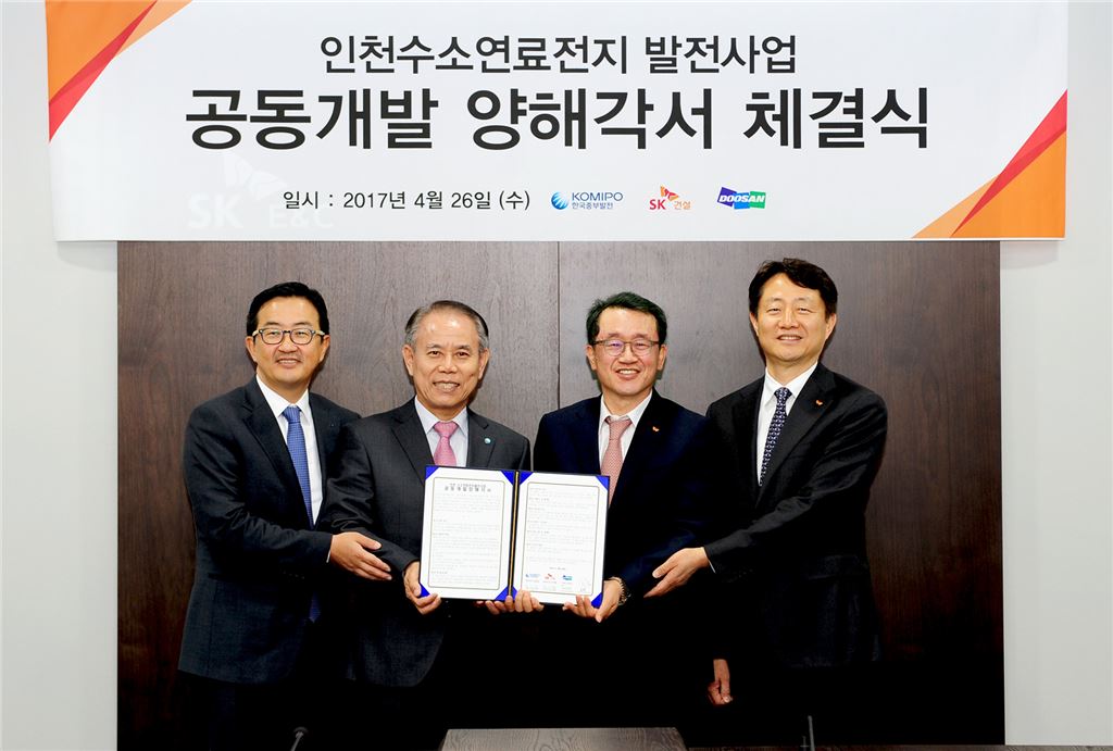 ▲ 조기행 SK건설 부회장(오른쪽에서 두번째)이 26일 중부발전, ㈜두산과 부생수소를 연료로 하는 수소연료전지 발전사업을 위한 MOU를 체결하고 기념촬영을 하고 있다.
