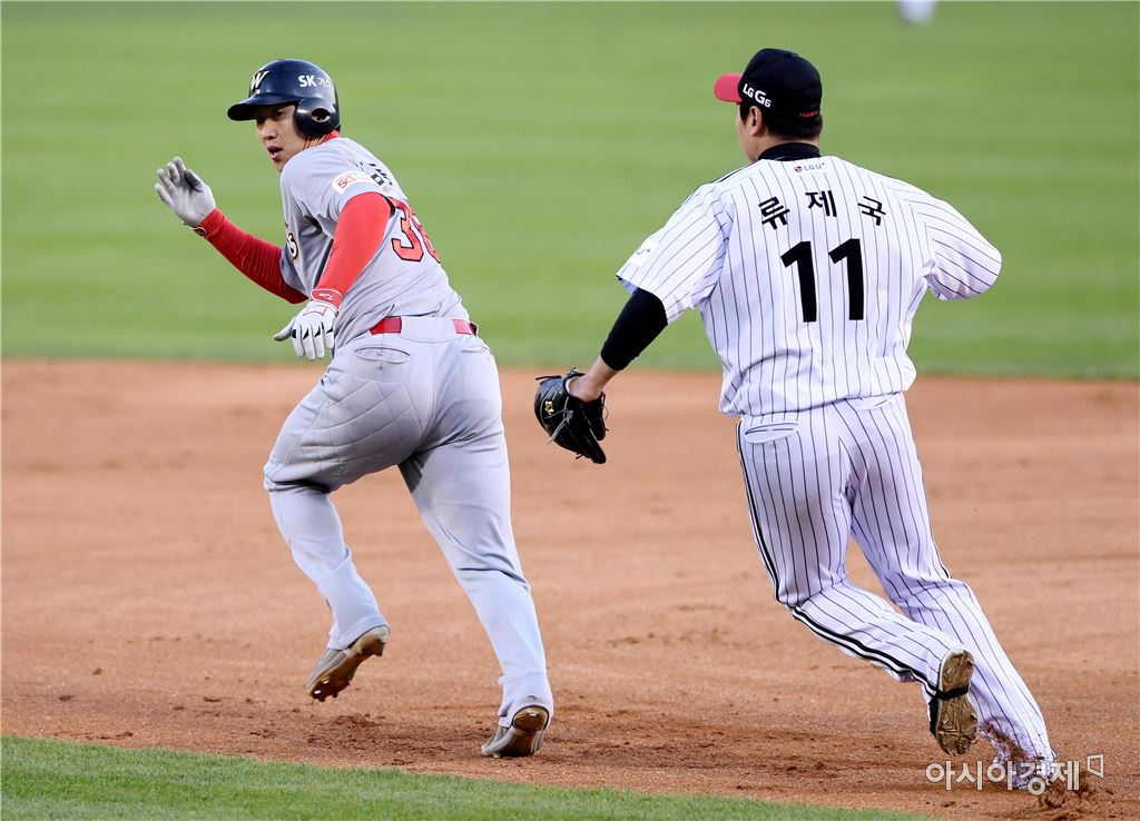 [아시아경제 김현민 기자]프로야구 SK 와이번스와 LG 트윈스의 2017 KBO리그 경기가 26일 잠실구장에서 열렸다. 2회초 무사 1루에서 SK 한동민 타석 때 1루주자 김동엽이 런다운에 걸려 LG 선발 류제국에게 쫓기고 있다. 김현민 기자 kimhyun81@asiae.co.kr<ⓒ세계를 보는 창 경제를 보는 눈, 아시아경제(www.asiae.co.kr) 무단전재 배포금지>