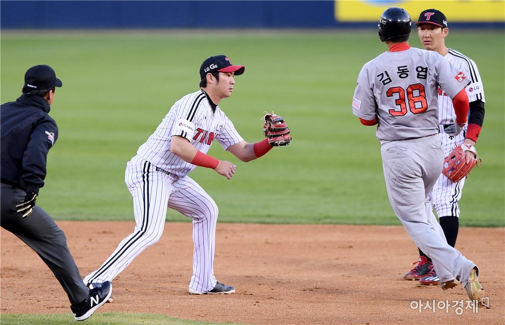 [아시아경제 김현민 기자]프로야구 SK 와이번스와 LG 트윈스의 2017 KBO리그 경기가 26일 잠실구장에서 열렸다. 2회초 무사 1루에서 LG 유격수 오지환이 SK 한동민 타석 때 런다운에 걸린 1루주자 김동엽을 태그아웃 시키고 있다. 김현민 기자 kimhyun81@asiae.co.kr<ⓒ세계를 보는 창 경제를 보는 눈, 아시아경제(www.asiae.co.kr) 무단전재 배포금지>