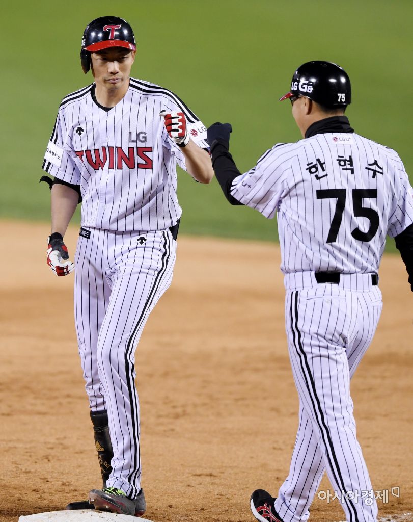 [아시아경제 김현민 기자]프로야구 SK 와이번스와 LG 트윈스의 2017 KBO리그 경기가 26일 잠실구장에서 열렸다. 4회말 1사 1,2루에서 LG 김용의가 좌전 안타를 치고 한혁수 코치와 하이파이브하고 있다.김현민 기자 kimhyun81@asiae.co.kr<ⓒ세계를 보는 창 경제를 보는 눈, 아시아경제(www.asiae.co.kr) 무단전재 배포금지>