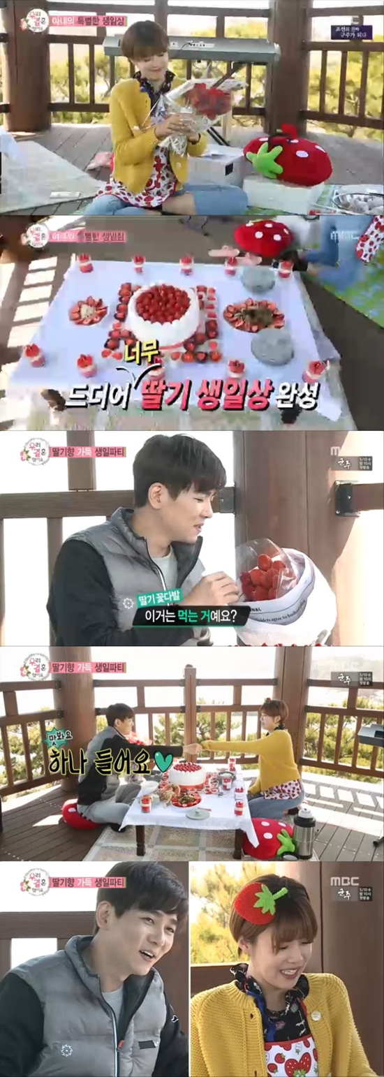 '우리 결혼했어요' 장도연이 최민용을 위한 특별한 생일상을 준비했다.29일 방송된 MBC '우리 결혼했어요'에서는 최민용의 생일상을 차리는 장도연의 모습이 그려졌다.이날 최민용은 가수 박은옥과 정태춘의 듀엣곡 '사랑하는 이에게'를 틀은 뒤 장도연에게 부부 듀엣을 제안했다.함께 노래를 부르던 중 주머니에서 주섬주섬 뭔가를 꺼내 장도연에게 건넸고 이를 본 장도연은 빵 터지며 뒤로 자빠졌다. 선물의 정체는 바로 장도연이 가장 좋아하는 캐릭터 가오나시 모양의 반지였다. 장도연의 손에 직접 반지를 끼워준 최민용은 "이제 어딜 가든 눈에 이런 것만 보인다"며 "다이아 반지는 아니지만 아내가 좋아하는 캐릭터다. 이 정도는 소소한 추억이 되겠지 싶었다"고 마음을 전했다. 이에 장도연은 "여자들은 알의 크기로 반지를 판단하는데 저한테는 가오나시 얼굴 크기가 캐럿이다"며 감동받은 모습을 보였다.이후 홀로 마실을 나간다며 최민용 몰래 생일상 준비에 나선 장도연은 정자에 숨어 남편이 좋아하는 딸기로 가득한 딸기 생일상을 만들었다. 딸기 케이크에 딸기 모양 캔들은 물론 딸기 머리핀·앞치마·방석에 심지어 직접 딸기로 꽃다발까지 만드어 눈길을 끌었다. 직접 잡채와 함경도식 대게 미역국을 만든 장도연은 "남편 어머님 고향이 함경도라고 들었다. 거기서는 게살 미역국을 먹는다고 하더라"라고 말해 남편에 대한 무한 애정을 표현했다.준비를 마친 장도연은 최민용에게 전화를 걸어 우편함으로 유인했고 우편함에 도착한 최민용은 편지와 함께 빨간 실을 발견했다. 편지에는 "생신 축하드려요. 부끄럽지만 생일 이벤트를 준비해 봤어요. 다음 생일도 챙겨드리길 바라요"라는 축하 인사와 함께 "실을 따라 오세요"라는 멘트가 적혀 있었다.실을 감으며 정자에 도착한 최민용은 장도연이 준비한 생일상을 본 뒤 웃음을 감추지 못했다. 엉성한 피아노 솜씨로 생일 축하곡을 연주한 장도연은 "남편이 감동할거라고 생각했는데 조금 빗나간게 많았다"며 아쉬워했다.하지만 최민용은 "내가 딸기를 좋아한다고 하니까 온 정자 안이 딸기로 도배돼 있었다"며 좋아하더니 함경도식 게살 미역국을 보고 "저희 어머니는 함경남도 분이다. 그냥 소고기 미역국 드신다"면서도 맛있게 먹어 장도연을 기쁘게 했다.또한 음식을 먹을 동안 듀엣곡으로 부르고 싶다고 했던 '사랑하는 이'에게를 연주하는 장도연에게 최민용은 "그 짧은 시간에 피아노 연주를 준비하고 연습했다는 게 너무 고마웠다"며 "미역국도 딸기도 다 고마웠지만 짧은 시간 연습한 그 정성이 고마웠다"고 감동을 전했다.장도연이 "밥먹고 연습하고 손에 익었다 싶을 정도로 계속했는데 너무 긴장됐다"며 안타까워하자 최민용은 "이벤트를 받는 게 익숙치 않다. 오히려 미안한 마음이 생겼다"며 "평생 못잊을 생일이다"라고 감사의 마음을 표현했다.디지털뉴스본부 송윤정 기자 singasong@asiae.co.kr<ⓒ세계를 보는 창 경제를 보는 눈, 아시아경제(www.asiae.co.kr) 무단전재 배포금지>