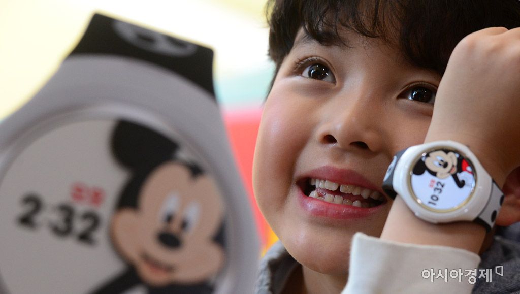 [아시아경제 문호남 수습기자] 30일 서울 을지로 SK텔레콤 T타워 어린이집에서 어린이들이 쿠키즈워치 '준(JooN) 스페셜 에디션' 3종을 착용하고 있다. 이번에 출시한 '준 스페셜 에디션'은 기존 쿠키즈워치 준3의 자녀안전 관리 및 방수 기능을 그대로 유지하면서, 디즈니와 마블 캐릭터를 시계와 밴드 및 메뉴 화면까지 새롭게 디자인한 모델로 출고가는 283,800원이다. 문호남 수습기자 munonam@asiae.co.kr<ⓒ세계를 보는 창 경제를 보는 눈, 아시아경제(www.asiae.co.kr) 무단전재 배포금지>