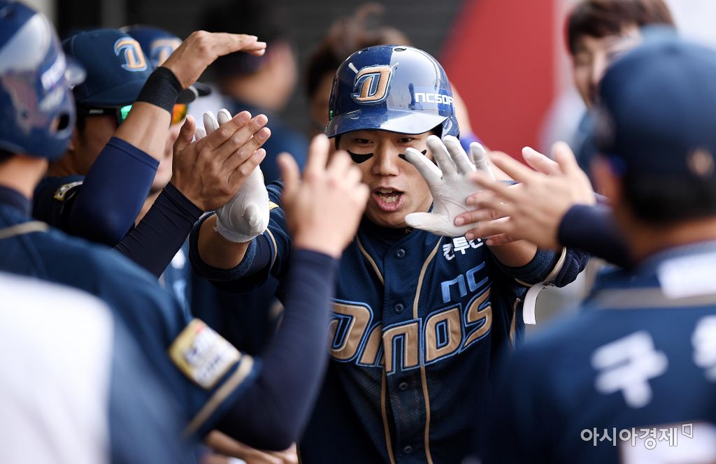 [광주=아시아경제 김현민 기자]프로야구 NC 다이노스와 KIA 타이거즈의 2017 KBO리그 경기가 30일 광주구장에서 열렸다. 8회초 2사에서 NC 모창민이 KIA 손영민을 상대로 백투백 홈런을 치고 동료들과 기뻐하고 있다. 김현민 기자 kimhyun81@asiae.co.kr<ⓒ세계를 보는 창 경제를 보는 눈, 아시아경제(www.asiae.co.kr) 무단전재 배포금지>