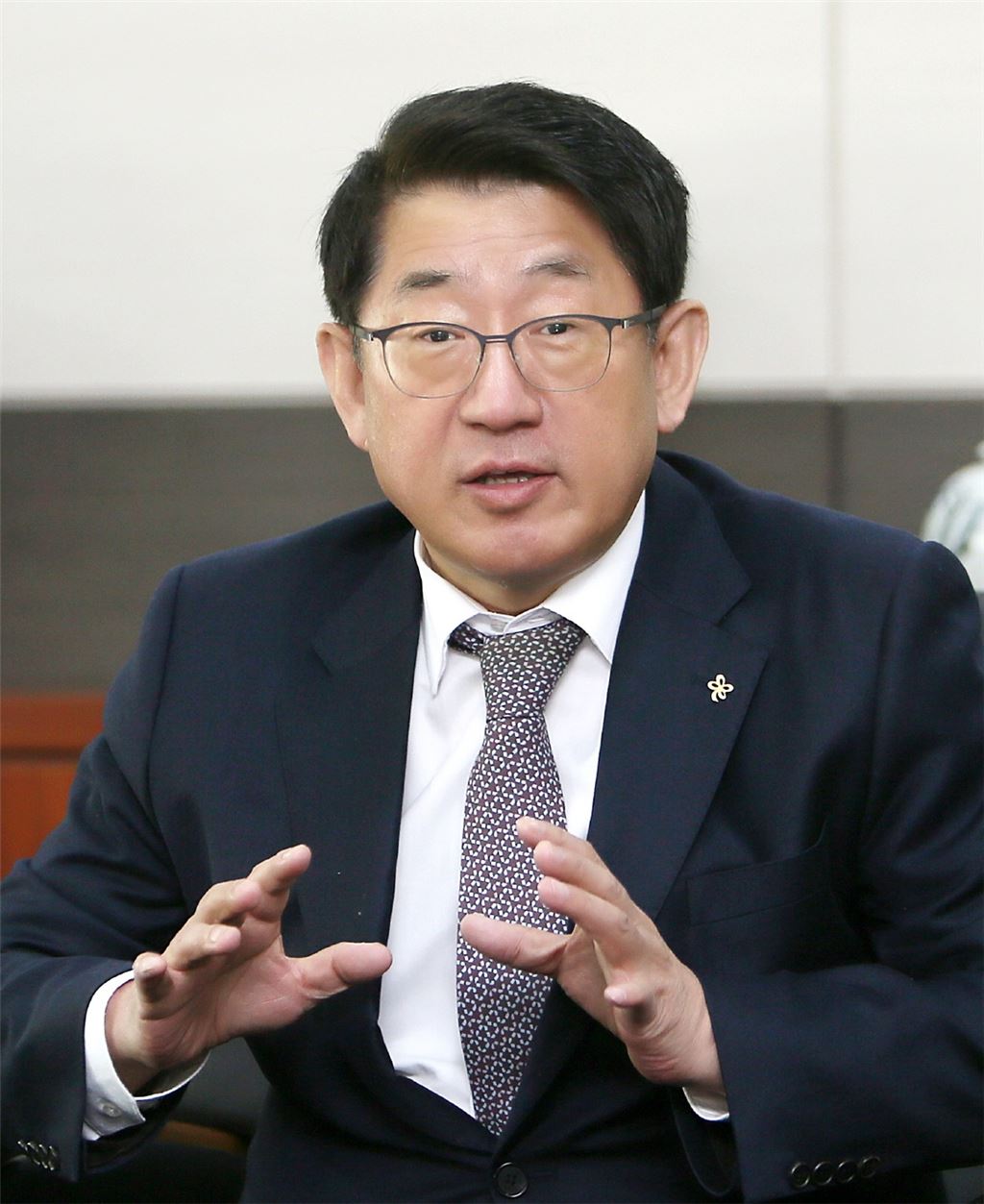 임채운 중진공 이사장이 지난달 28일 경남 통영에서 간담회를 열고 구조조정으로 어려움을 겪는 중소기업에 대해 정책자금을 신속하게 집행하겠다고 말하고 있다.