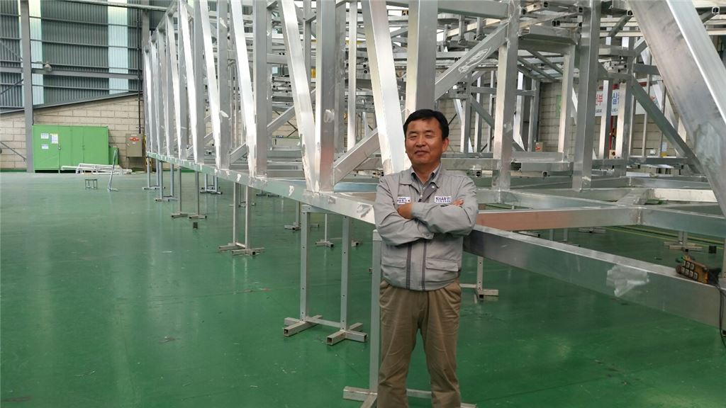 박기태 칸정공 대표가 세계적인 기술력으로 생산한 '알루미늄 소재 해양플랜트 구조물' 앞에서 포즈를 취하고 있다.