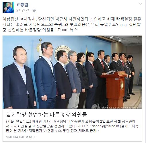 더불어민주당 표창원 의원이 바른정당 탈당 의원 13명에 관해 '이합집산, 철새정치'라며 부끄럽다고 말했다.2일 표 의원은 자신의 페이스북을 통해 "이합집산, 철새정치, 당선되면 박근혜 사면하겠다고 선언하고 헌재 탄핵 결정 잘못됐다는 홍준표 자유한국당으로 복귀"라면서 "왜 부끄러움은 우리 몫일까요?"라고 말했다.한편 표 의원은 장제원 의원과 반말을 하며 언성을 높인 적이 있다. 이후 두 의원은 JTBC ‘썰전’에 출연해 서로 사과하며 박근혜 전 대통령에 대한 탄핵 가결과 이후 깊어지고 있는 새누리당의 분열사태에 대해 대화를 나눴다.당시 방송에서 표 의원은 장 의원에게 "아무리 여당 의원이라도 진실을 밝혀내는 모습을 보는 게 정말 존경스럽다"고 칭찬했다.디지털뉴스본부 윤재길 기자 mufrookie@asiae.co.kr<ⓒ세계를 보는 창 경제를 보는 눈, 아시아경제(www.asiae.co.kr) 무단전재 배포금지>윤재길 기자 mufrookie@asiae.co.kr<ⓒ아시아 대표 석간 '아시아경제' (www.newsva.co.kr) 무단전재 배포금지>