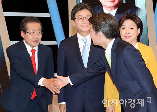 [국회사진취재단] 안철수 국민의당, 홍준표 자유한국당 대선후보가 2일 서울 상암동 MBC 스튜디오에서 선거관리위원회 주최로 열린 마지막 TV토론에 앞서 인사를 나누고 있다.윤동주 기자 doso7@asiae.co.kr<ⓒ세계를 보는 창 경제를 보는 눈, 아시아경제(www.asiae.co.kr) 무단전재 배포금지>