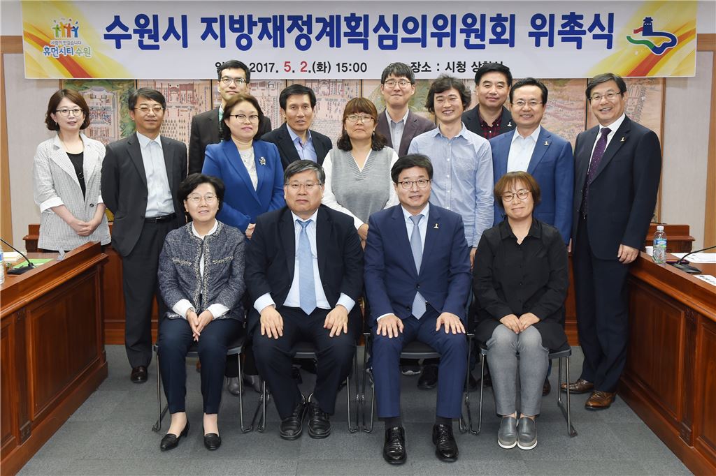 염태영 수원시장(앞줄 오른쪽 두번째)이 지방재정계획위원회 위원들에게 위촉장을 전달한 뒤 기념사진을 찍고 있다.