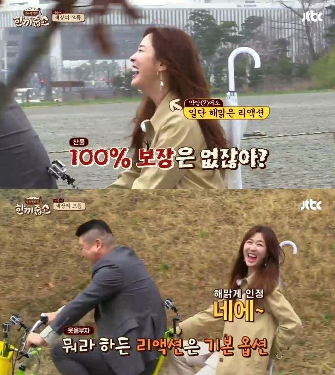 배우 이수경이 폭풍 리액션과 긍정적인 태도를 보여 시청자들을 사로잡았다. 3일 방송된 JTBC ‘한끼줍쇼’에서는 이수경, 그룹 비투비 육성재가 출연해 한 끼에 도전했다. 이날 이수경은 강호동의 어떤 말을 해도 잘 받아주며 리액션 장인으로 등극했다. 강호동은 과거 예능프로그램 ‘천생연분’에서 호흡을 맞췄던 이수경에게 “방부제 미모다. 10년이 훨씬 지났는데 마치 타임머신을 타고 돌아온 것 같다”고 말했다. 이에 이수경은 “오빠도 그대로요”며 해맑게 웃었다. 이경규는 이수경에게 “굉장히 해맑다”고 칭찬했다. 이수경은 “네. 저는 행복하게 살고 싶어요. 하루하루 최선을 다해서 살고 싶다”고 말해 긍정의 아이콘으로 등극했다. 또한 이수경은 비가 오는 궂은 날씨에도 “우리를 반겨주는 봄비~”라고 흥얼거렸다. 디지털뉴스본부 최누리 기자 asdwezx1@asiae.co.kr<ⓒ세계를 보는 창 경제를 보는 눈, 아시아경제(www.asiae.co.kr) 무단전재 배포금지>