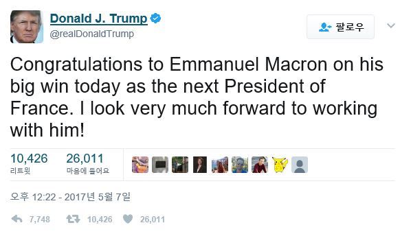 트위터를 통해 마크롱에 당선 축하인사 건넨 도널드 트럼프 미국 대통령. (사진=트위터 캡처)