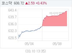 2017년 05월 08일 코스닥 지수는 8.28p (1.30%) 상승한 643.39로 마감했습니다.금일 (3시10분 기준) 코스닥 주요 상승 종목은 이엘케이,크린앤사이언스,DSC인베스트먼트이며, 코스닥 주요 하락 종목은 에스에스컴텍,인콘,인프라웨어입니다.아경봇 기자 r2@asiae.co.kr<ⓒ세계를 보는 창 경제를 보는 눈, 아시아경제(www.asiae.co.kr) 무단전재 배포금지>