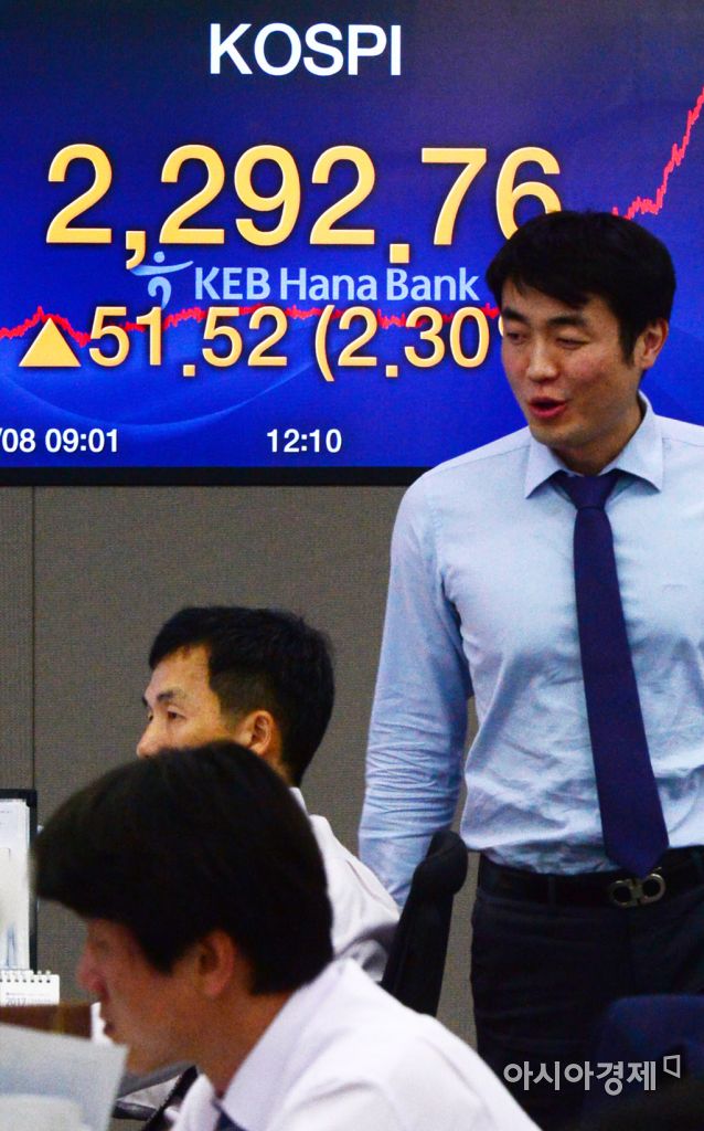 [아시아경제 문호남 수습기자] 코스피 지수가 사상 최고치를 기록한 8일 서울 중구 을지로 KEB하나은행 본점 딜링룸에서 딜러들이 업무를 보고 있다. 이날 코스피 지수는 전 거래일보다 51.52포인트(2.30%) 오른 2,292.76에 장을 마감했다.문호남 수습기자 munonam@asiae.co.kr<ⓒ세계를 보는 창 경제를 보는 눈, 아시아경제(www.asiae.co.kr) 무단전재 배포금지>