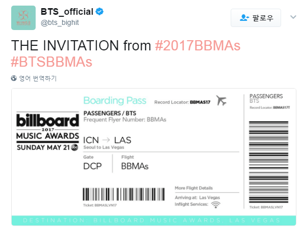 방탄소년단이 미국 빌보드 뮤직 어워드 시상식에 케이팝 그룹 최초로 참석한다.9일 방탄소년단 측은 21일 오후 8시(현지시간) 미국 라스베이거스 T-모바일 아레나에서 열리는 '2017 빌보드 뮤직 어워드(The 2017 Billboard Music Awards)'에 공식적으로 초청받아 참석을 확정했다고 말했다.방탄소년단 美 빌보드 시상식 참석/사진=방탄소년단 소속사 측 공식 트위터 계정 캡처