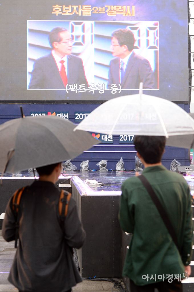 [아시아경제 문호남 수습기자] 제19대 대통령 선거일인 9일 서울 종로구 광화문 광장에서 시민들이 비가 내리는 궂은 날씨 속 한 방송사의 개표 방송을 기다리고 있다. 문호남 수습기자 munonam@asiae.co.kr<ⓒ세계를 보는 창 경제를 보는 눈, 아시아경제(www.asiae.co.kr) 무단전재 배포금지>