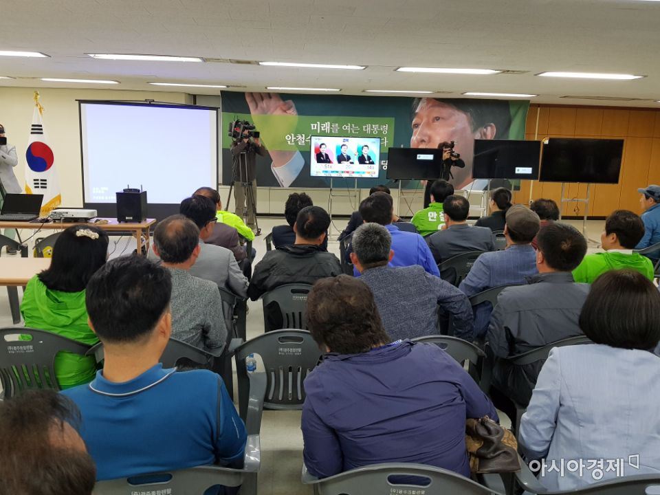 국민의당 광주광역시당 관계자들이 중앙방송 3사가 9일 실시한 제19대 대통령 선거 출구조사 방송을 지켜보고 있다.