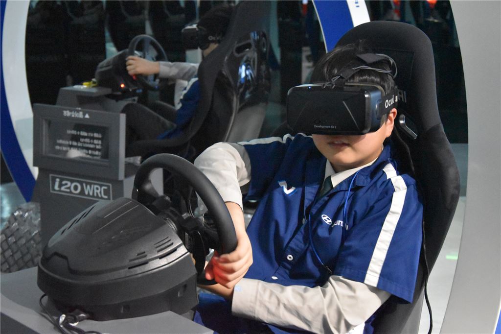 한국잡월드 현대자동차관에서 현장체험학습에 참여한 학생이 i20 WRC카 체험을 하는 모습