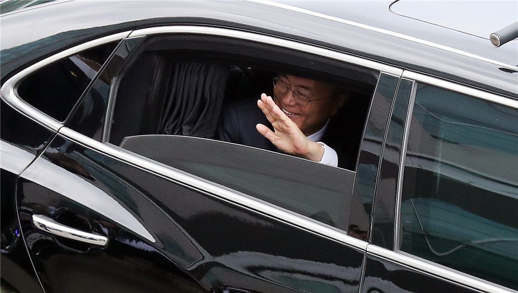 [서울=연합뉴스] 문재인 대통령이 10일 낮 서울 여의도 국회의사당에서 취임선서를 마친 뒤 국회직원과 시민들을 향해 손을 들어 인사하고 있다.<저작권자 ⓒ ㈜연합뉴스. 무단 전재 재배포 금지.>