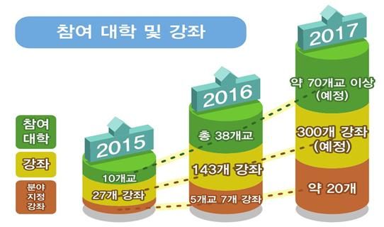 [아시아경제 조인경 기자] 건국대와 경성대, 단국대, 서강대, 서울시립대, 숭실대, 전남대, 제주대, 중앙대, 한동대 등이 올해 한국형 온라인 공개강좌 '케이무크(K-MOOC)'를 선보인다.교육부와 국가평생교육진흥원은 '2017년 K-MOOC(Korea Massive Open Online Course) 사업'에 참여할 이들 10개 대학을 선정, 11일 발표했다 K-MOOC는 대학의 우수한 강좌를 인터넷을 통해 일반 국민에게 공개하는 사업으로, 지난 2015년 10월 첫 서비스를 개통한 이후 현재까지 약 295만명이 사이트를 방문하고, 약 26만명이 수강신청을 할 정도로 관심이 높아지고 있다.교육부는 K-MOOC 서비스의 안정화 및 활성화를 위해 올해 160개 이상의 강좌를 새로 개발해 기존 강좌 143개와 합친 총 300개 이상의 강좌를 운영할 예정이다.특히, 올해 신규 개발 강좌는 4차 산업혁명에 대비한 공학 및 자연분야, 지역특화 및 기초교양강좌, 학문간 융합강좌, 한국어 강좌 등 국?내외 학습자의 수요가 높은 분야에서 중점 개발될 계획이다.올해 무크선도대학은 27개 대학이 신청해 이 중 10개교가 최종 선정됐으며, 선정된 대학은 4차 산업혁명 대비 학문간 융합, 지역 특성을 고려한 특화 과정 등을 자체 계획에 따라 2개 강좌씩 개발할 예정이다.기존 2015~16년에 선정된 무크선도대학 20곳에서도 각각 3개 강좌 이상씩 총 60개 강좌를 추가한다. 또 4차 산업혁명 관련, 지역특화 분야 및 기초교양, 한국학 등 학습자의 수요가 많은 분야에 대한 강좌 공모를 통해 총 18개 강좌가 선정돼 일정에 따라 선보인다.이들 무크선도대학과 분야지정 강좌는 3년간 개발비(강좌당 5000만원)와 운영비(강좌당 약 1200만원)를 총액으로 지원받게 된다.교육부의 이외에도 대학재정지원사업 지원을 받는 대학 중 K-MOOC 강좌 개발을 희망하는 대학에 대해 추후 별도 심사를 거쳐 강좌를 추가로 개발·운영하도록 할 계획이다.이영 교육부 차관은 "K-MOOC 강좌를 통해 급변하는 4차 산업혁명시대에 학습자의 다양한 관심 분야와 요구에 적극 부응하고 미래경쟁력을 갖춘 인재 개발에 기여할 수 있을 것"이라며 "강좌의 다양성 확보 및 질 제고를 위해 지속적인 관심과 노력을 기울이겠다"고 말했다.조인경 기자 ikjo@asiae.co.kr<ⓒ세계를 보는 창 경제를 보는 눈, 아시아경제(www.asiae.co.kr) 무단전재 배포금지>