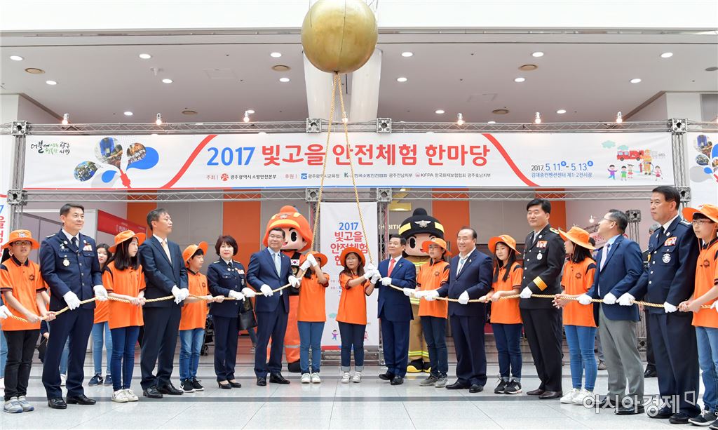[아시아경제 노해섭 기자]윤장현 광주광역시장이 11일 오전 서구 김대중컨벤션센터 제1전시관에서 열린 ‘2017 빛고을 안전체험 한마당’ 개막식에 참석해 이은방 광주시의회 의장, 장휘국 광주시교육감, 마재윤 광주소방본부장, 한국 119소년단 등 주요 내빈들과 개막 이벤트인 ‘안전광주’ 대박을 터트리고 있다.