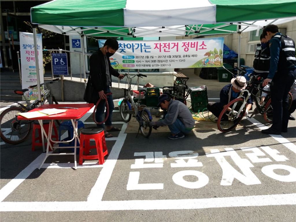성남시에서 추진하는 지역공동체 일자리사업에 참여한 시민이 자전거를 정비하고 있다.