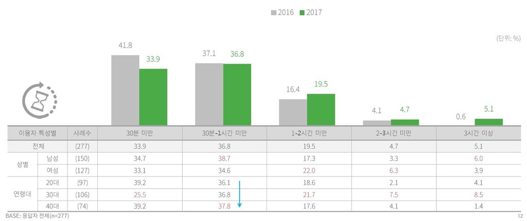 [아시아경제 한진주 기자] 모바일 게임 이용자 10명 중 7명은 하루 평균 1시간 미만 모바일 게임을 이용하는 것으로 조사됐다.13일 DMC미디어가 만 19세 이상~49세 이하 277명을 대상으로 조사한 결과를 담은 '모바일 게임 이용 행태'에 따르면 하루에 1시간 미만 이용한다는 응답자는 70.7%를 차지했다. 1시간 이상 게임을 하는 이용자(29.3%) 중에서는 ▲2시간 미만 19.5% ▲3시간 이상 5.1% ▲3시간 미만 4.7% 순이었다. DMC미디어는 "지난해보다 1시간 이상 이용하는 비율이 늘었는데, 플레이시간이 짧은 두뇌, 퍼즐, 보드게임 이용률이 줄고 증강현실 게임 이용률이 증가했기 때문"이라고 설명했다.모바일 게임 내에서 캐릭터나 아이템 등 인앱구매를 경험한 비율은 지난해보다 5.7%p 증가한 37.5%를 기록했다.이용자 중에서 여성과 30대의 모바일 인앱 구매 경험이 높게 나타났다. 성별로는 ▲여성 38.6% ▲남성 37.5%였고, 연령별로는 ▲30대 41.5% ▲40대 37.8% ▲20대 33.0%였다.6개월 평균 모바일 게임 다운로드 갯수(출처=DMC미디어)