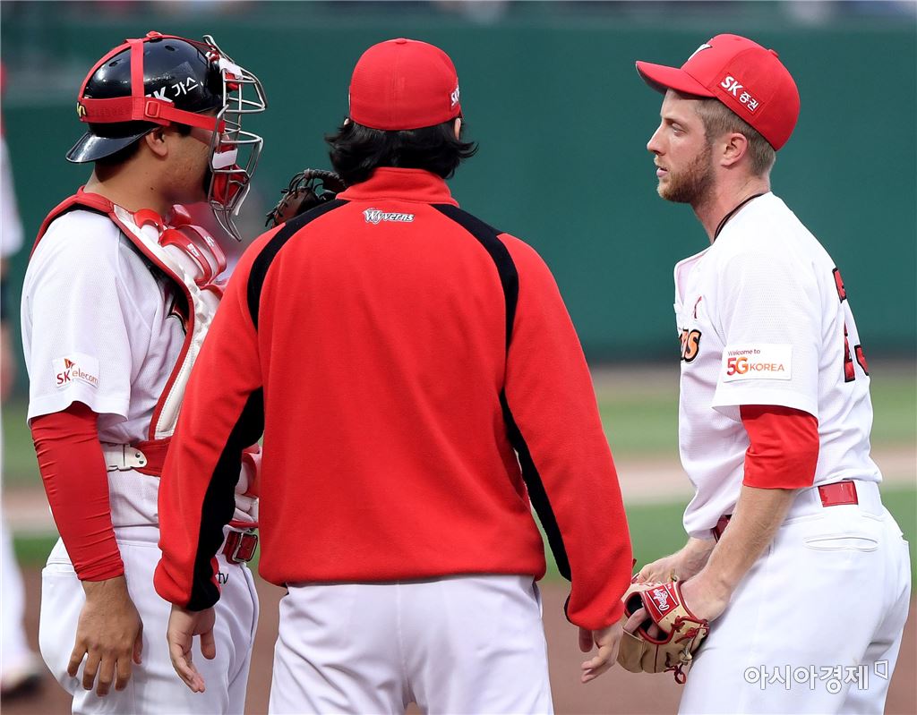 [인천=아시아경제 김현민 기자]프로야구 KIA 타이거즈와 SK와이번스의 2017 KBO리그 경기가 12일 인천 SK행복드림구장에서 열렸다. SK 선발 켈리가 2회초 2사 1,2루에서 위기에서 이재원 포수와 이야기하고 있다. 김현민 기자 kimhyun81@asiae.co.kr<ⓒ세계를 보는 창 경제를 보는 눈, 아시아경제(www.asiae.co.kr) 무단전재 배포금지>