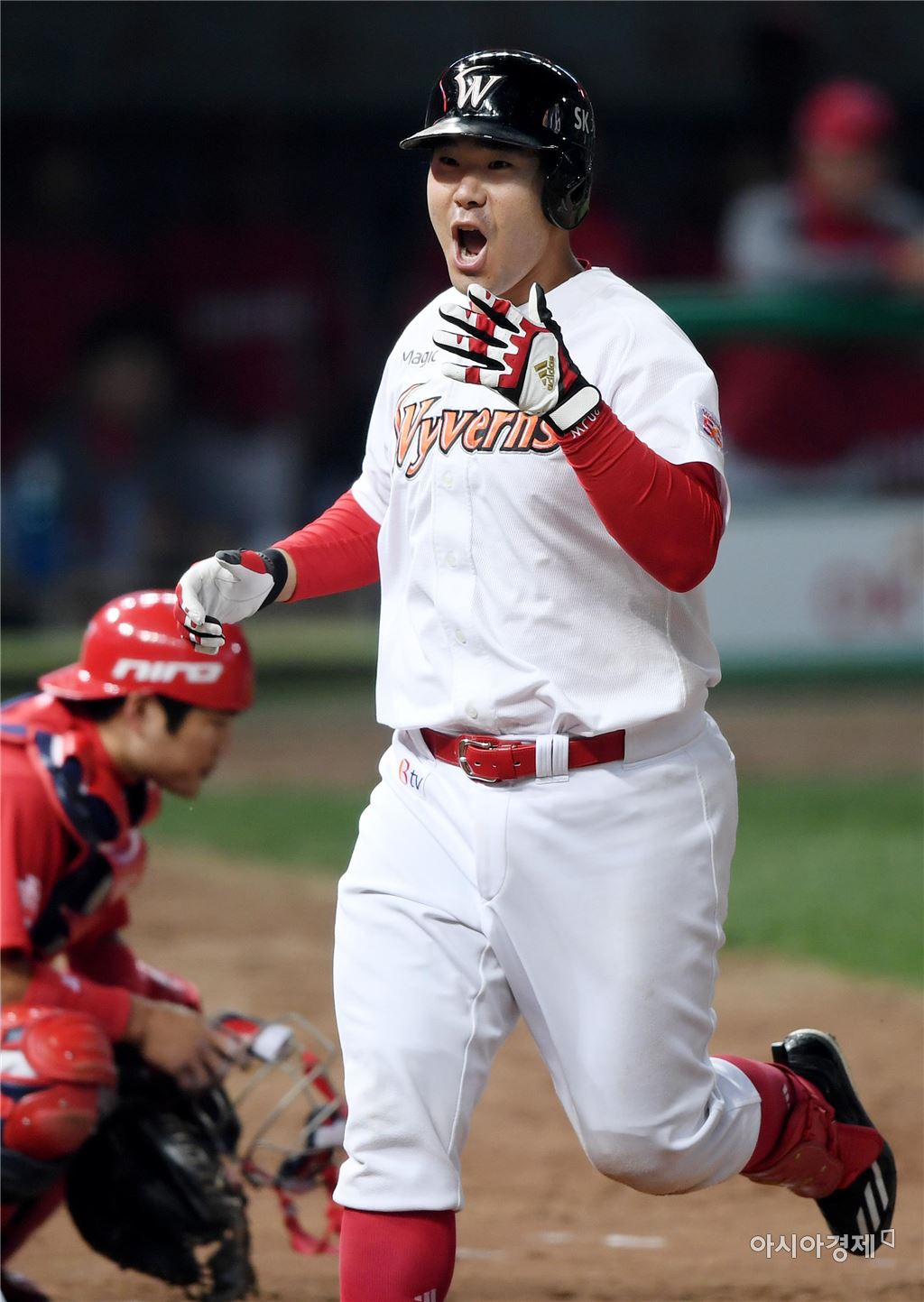 [인천=아시아경제 김현민 기자]프로야구 KIA 타이거즈와 SK와이번스의 2017 KBO리그 경기가 12일 인천 SK행복드림구장에서 열렸다. 6회말 2사 2,3루에서 SK 이재원이 KIA 김윤동을 상대로 역전 3점 홈런을 치고 환호하고 있다. 김현민 기자 kimhyun81@asiae.co.kr<ⓒ세계를 보는 창 경제를 보는 눈, 아시아경제(www.asiae.co.kr) 무단전재 배포금지>