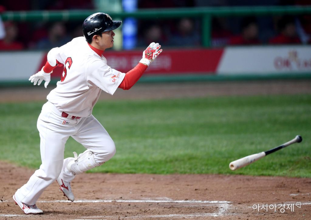 [인천=아시아경제 김현민 기자]프로야구 KIA 타이거즈와 SK와이번스의 2017 KBO리그 경기가 12일 인천 SK행복드림구장에서 열렸다. 8회말 무사 1루에서 SK 로맥이 유격수 내야 안타를 치고 출루한 뒤 미소 짓고 있다. 김현민 기자 kimhyun81@asiae.co.kr<ⓒ세계를 보는 창 경제를 보는 눈, 아시아경제(www.asiae.co.kr) 무단전재 배포금지>