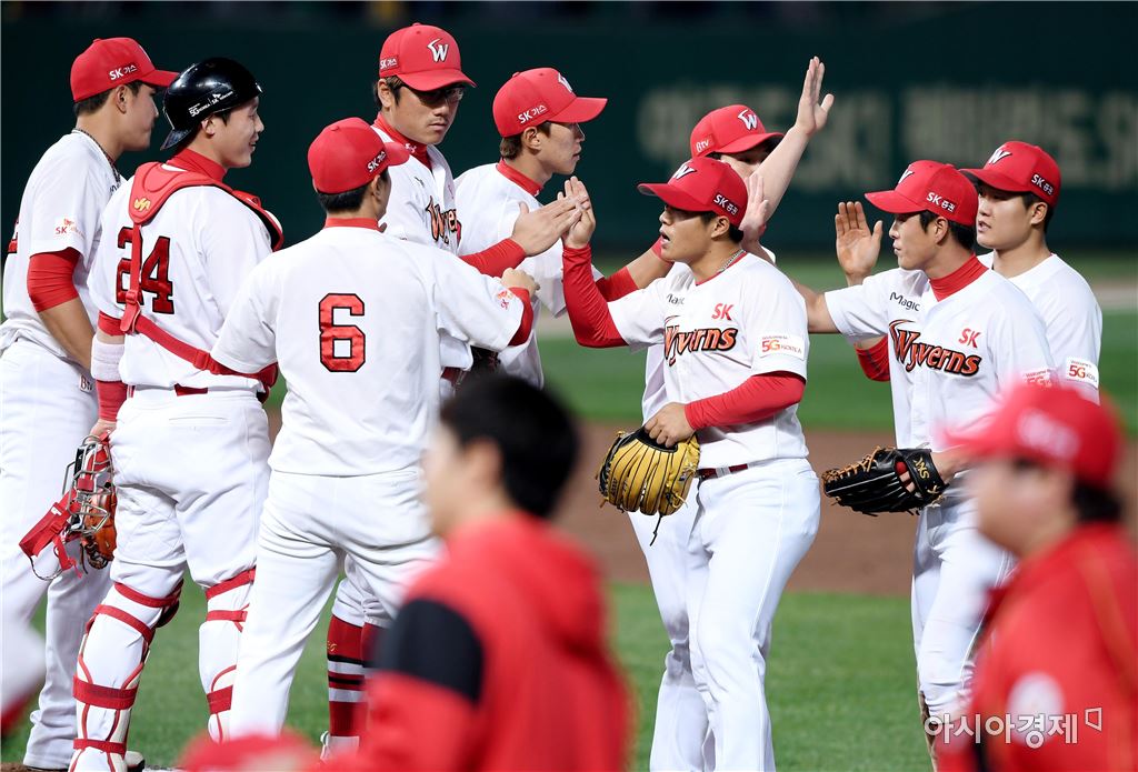 [인천=아시아경제 김현민 기자]프로야구 KIA 타이거즈와 SK와이번스의 2017 KBO리그 경기가 12일 인천 SK행복드림구장에서 열렸다. SK 선수들이 8-2 승리를 확정한 뒤 기뻐하고 있다. 김현민 기자 kimhyun81@asiae.co.kr<ⓒ세계를 보는 창 경제를 보는 눈, 아시아경제(www.asiae.co.kr) 무단전재 배포금지>