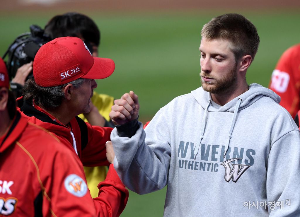 [인천=아시아경제 김현민 기자]프로야구 KIA 타이거즈와 SK와이번스의 2017 KBO리그 경기가 12일 인천 SK행복드림구장에서 열렸다. SK 켈리가 8-2 승리를 확정한 뒤 힐만 감독과 기뻐하고 있다. 켈리는 선발 등판해 7이닝 2실점 호투로 시즌 3승을 챙겼다. 김현민 기자 kimhyun81@asiae.co.kr<ⓒ세계를 보는 창 경제를 보는 눈, 아시아경제(www.asiae.co.kr) 무단전재 배포금지>