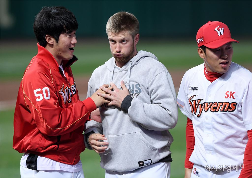 [인천=아시아경제 김현민 기자]프로야구 KIA 타이거즈와 SK와이번스의 2017 KBO리그 경기가 12일 인천 SK행복드림구장에서 열렸다. SK 켈리가 8-2 승리를 확정한 뒤 박종훈의 축하를 받고 있다. 켈리는 선발 등판해 7이닝 2실점 호투로 시즌 3승을 챙겼다. 김현민 기자 kimhyun81@asiae.co.kr<ⓒ세계를 보는 창 경제를 보는 눈, 아시아경제(www.asiae.co.kr) 무단전재 배포금지>