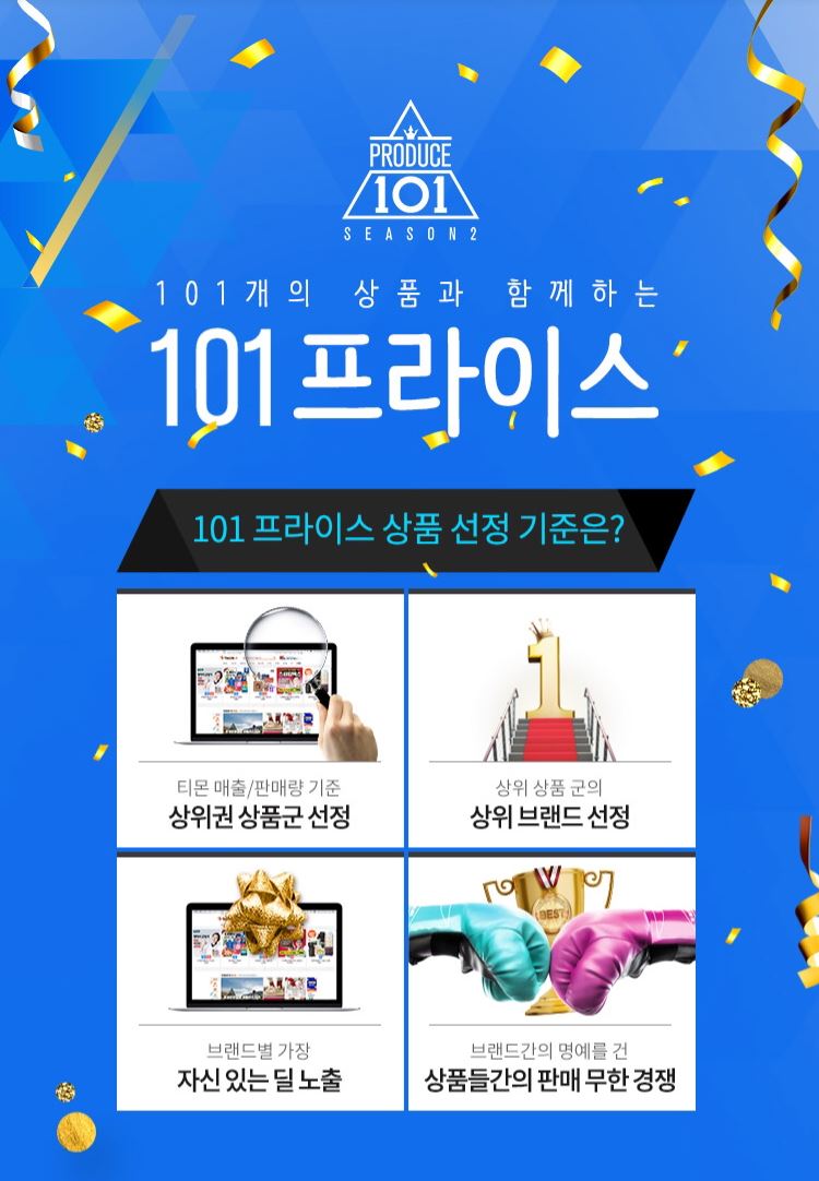 티몬, '프라이스 101' 프로모션 진행[아시아경제 김유리 기자] 티켓몬스터가 운영하는 소셜커머스 티몬은 국민 보이그룹 육성 프로그램 Mnet '프로듀스101 시즌2' 2차 투표를 진행한다고 16일 밝혔다. 티몬의 각 분야별 인기 브랜드 101가지를 선정해 판매하는 '프라이스101' 프로모션도 함께 실시한다.티몬 프라이스 101은 프로듀스 101의 방식을 본떠 기획됐다. 티몬의 각 분야별 인기 제품 101가지를 선정해 판매하고, 기획전 기간 내 판매액과 판매량을 토대로 가장 인기 있는 상품 11가지를 선정하는 방식으로 진행된다. 프로듀스101 시즌2의 연습생처럼 프라이스101 브랜드도 경합을 벌이고 있다. 최상위권은 브랜드 인지도와 높은 할인율을 토대로 순위가 엎치락 뒤치락하는 모양새다. 현재 1위는 하기스 기저귀, 2위는 킨도 기저귀 등 육아필수품인 기저귀 브랜드다. 하기스 기저귀는 33% 할인한 2만2900원, 킨도 기저귀는 3만9900원에 판매된다. 이밖에 상위 10위 브랜드에는 소호 패션 브랜드 네 개가 몰렸다. 3위를 차지한 소호 브랜드 에이블린에서는 여성 티셔츠를 3900원부터, 6위를 차지한 아동 소호 브랜드 뿌니뿌니에서는 티셔츠는 5900원부터 구입할 수 있다.'101 소년들이 좋아할 스타일'은 뷰티PD의 추천상품들을 모아놓은 코너로 인기가 높고, '프로듀스101'을 협찬하는 제품들을 모아놓은 전용관, 특별한 가격과 이벤트로 진행되는 '리미티드101' 프로모션 등 다양한 연관 상품들을 판매하는 기획전도 함께 진행 중이다. 김준수 티몬 최고 마케팅 책임자(CMO)는 "티몬은 단순한 프로모션이나 가격할인만을 하는 쇼핑몰이 아닌 다른 곳에서는 찾기 어려운 스토리를 담은 라이프스타일 커머스"라며 "프로듀스 101으로 투표의 재미와 함께 프라이스 101으로 쇼핑의 재미를 함께 즐기길 바란다"고 말했다. 김유리 기자 yr61@asiae.co.kr<ⓒ세계를 보는 창 경제를 보는 눈, 아시아경제(www.asiae.co.kr) 무단전재 배포금지>