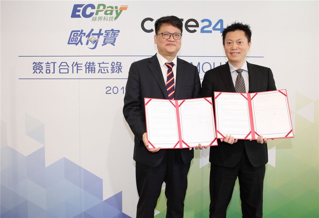 이재석 카페24 대표(왼쪽)가 16일 대만 온라인 전자결제 서비스 1위 기업인 이씨페이와 업무협약을 체결하고 기념촬영을 하고 있다.