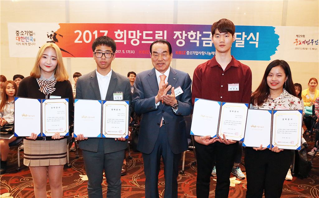 [아시아경제 정동훈 기자] 17일 중소기업사랑나눔재단이 주최한 '2017 희망드림 장학사업' 전달식에서 서석홍 중소기업사랑나눔재단 이사장과 장학생들이 기념촬영을 하고 있다. 중소기업사랑나눔재단은 이날 중소기업·소상공인 자녀 100명에게 장학금 3억2000만원을 전달했다. 서석홍 중소기업사랑나눔재단 이사장은 "오늘 이 자리에 모인 장학생들이 중소기업의 꿈나무"라며 "중소기업 자녀들이 대한민국의 미래를 이끄는 인재로 성장할 수 있도록 재단이 밑거름 역할을 하겠다"고 밝혔다.정동훈 기자 hoon2@asiae.co.kr<ⓒ세계를 보는 창 경제를 보는 눈, 아시아경제(www.asiae.co.kr) 무단전재 배포금지>