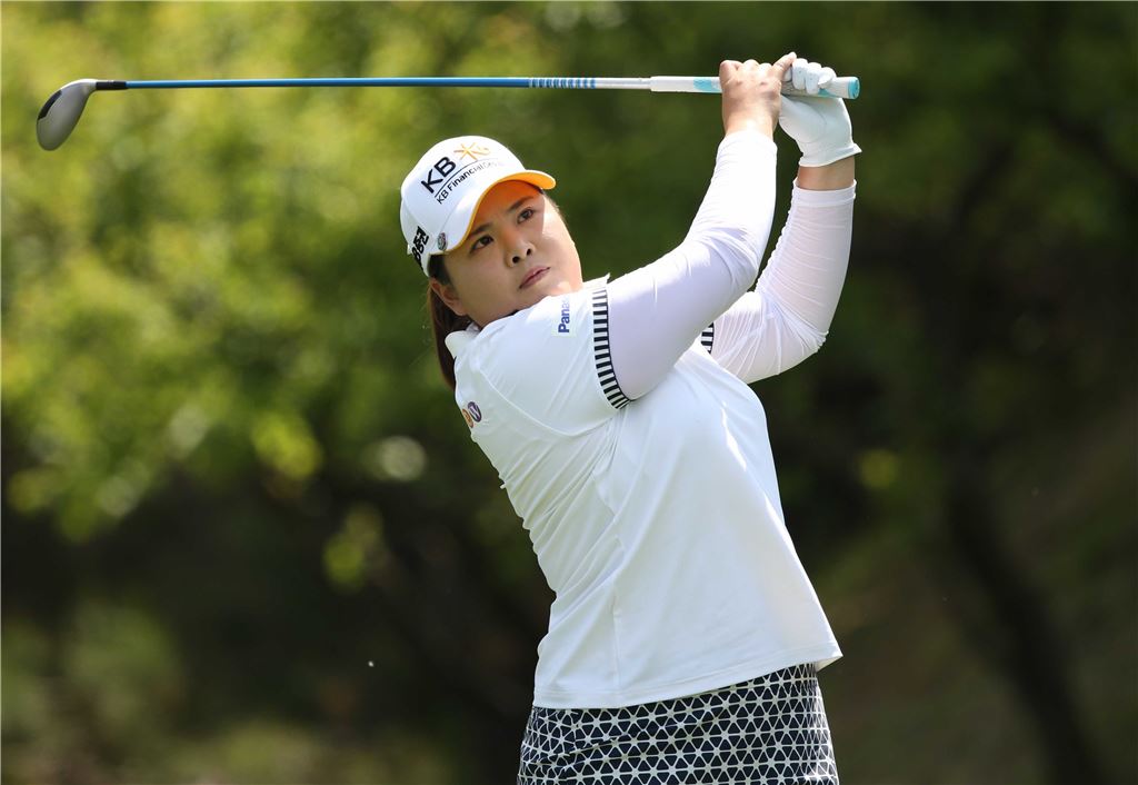 박인비가 두산매치플레이 첫날 5번홀에서 티 샷을 하고 있다. 사진=KLPGA