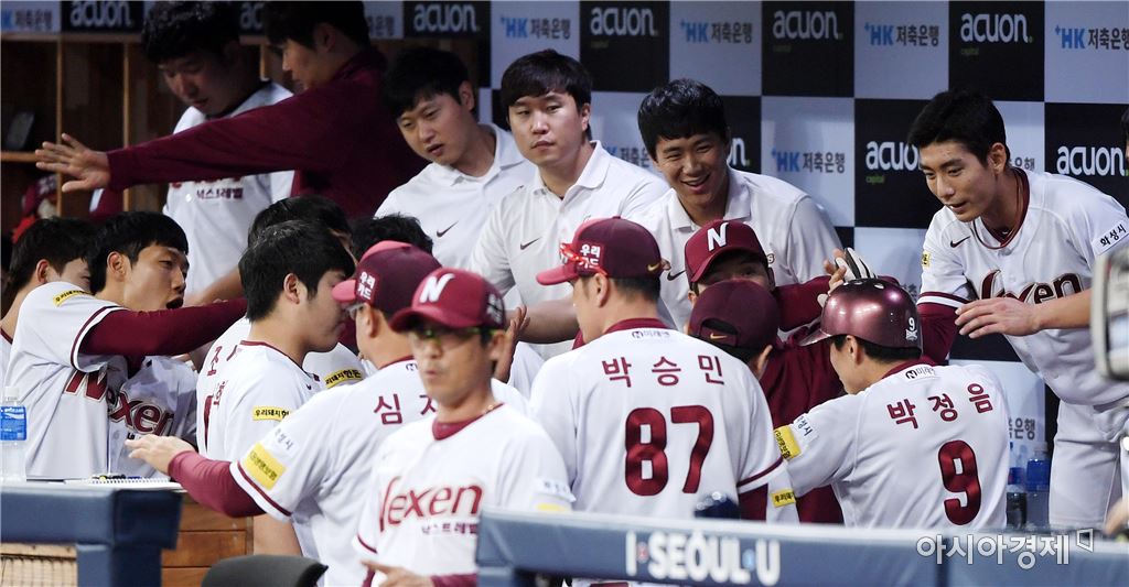 [아시아경제 김현민 기자]프로야구 한화 이글스와 넥센 히어로즈의 2017 KBO리그 경기가 17일 서울 고척돔에서 열렸다. 1회초 1사 3루에서 넥센 윤석민의 선취 1타점 적시타 때 득점을 올린 박정음이 동료들의 환영을 받고 있다. 김현민 기자 kimhyun81@asiae.co.kr<ⓒ세계를 보는 창 경제를 보는 눈, 아시아경제(www.asiae.co.kr) 무단전재 배포금지>