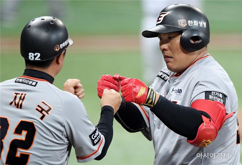 [아시아경제 김현민 기자]프로야구 한화 이글스와 넥센 히어로즈의 2017 KBO리그 경기가 17일 서울 고척돔에서 열렸다. 3회초 1사 2루에서 한화 김태균이 역전 1타점 적시타를 치고 윤재국 코치와 하이파이브하고 있다. 김태균은 이 안타로 71경기 연속 출루 기록을 세웠다.김현민 기자 kimhyun81@asiae.co.kr<ⓒ세계를 보는 창 경제를 보는 눈, 아시아경제(www.asiae.co.kr) 무단전재 배포금지>