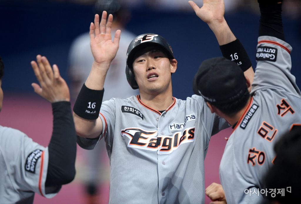 [아시아경제 김현민 기자]프로야구 한화 이글스와 넥센 히어로즈의 2017 KBO리그 경기가 17일 서울 고척돔에서 열렸다. 6회초 1사 1,3루에서 한화 정근우의 1타점 내야 땅볼 때 3루주자 하주석이 득점한 뒤 동료들과 하이파이브하고 있다.김현민 기자 kimhyun81@asiae.co.kr<ⓒ세계를 보는 창 경제를 보는 눈, 아시아경제(www.asiae.co.kr) 무단전재 배포금지>