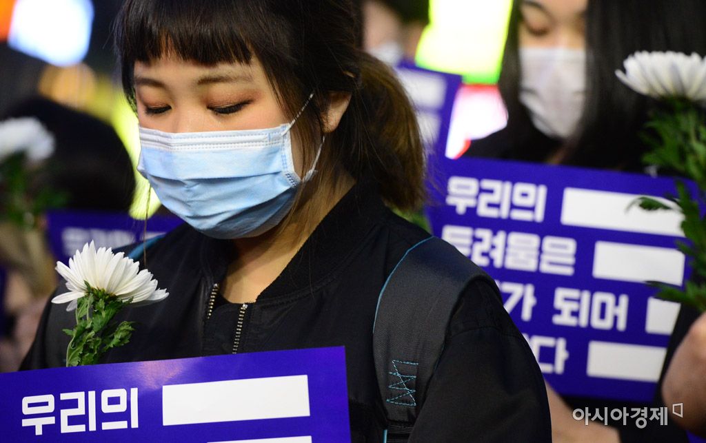 [아시아경제 문호남 수습기자] 강남역 여성 살인 사건 1주기인 17일 서울 강남구 신논현역 6번 출구 앞에서 열린 추모문화제에 참가한 시민들이 강남역 10번 출구 방향으로 행진을 하는 중 묵념을 하고 있다.문호남 수습기자 munonam@asiae.co.kr<ⓒ세계를 보는 창 경제를 보는 눈, 아시아경제(www.asiae.co.kr) 무단전재 배포금지>